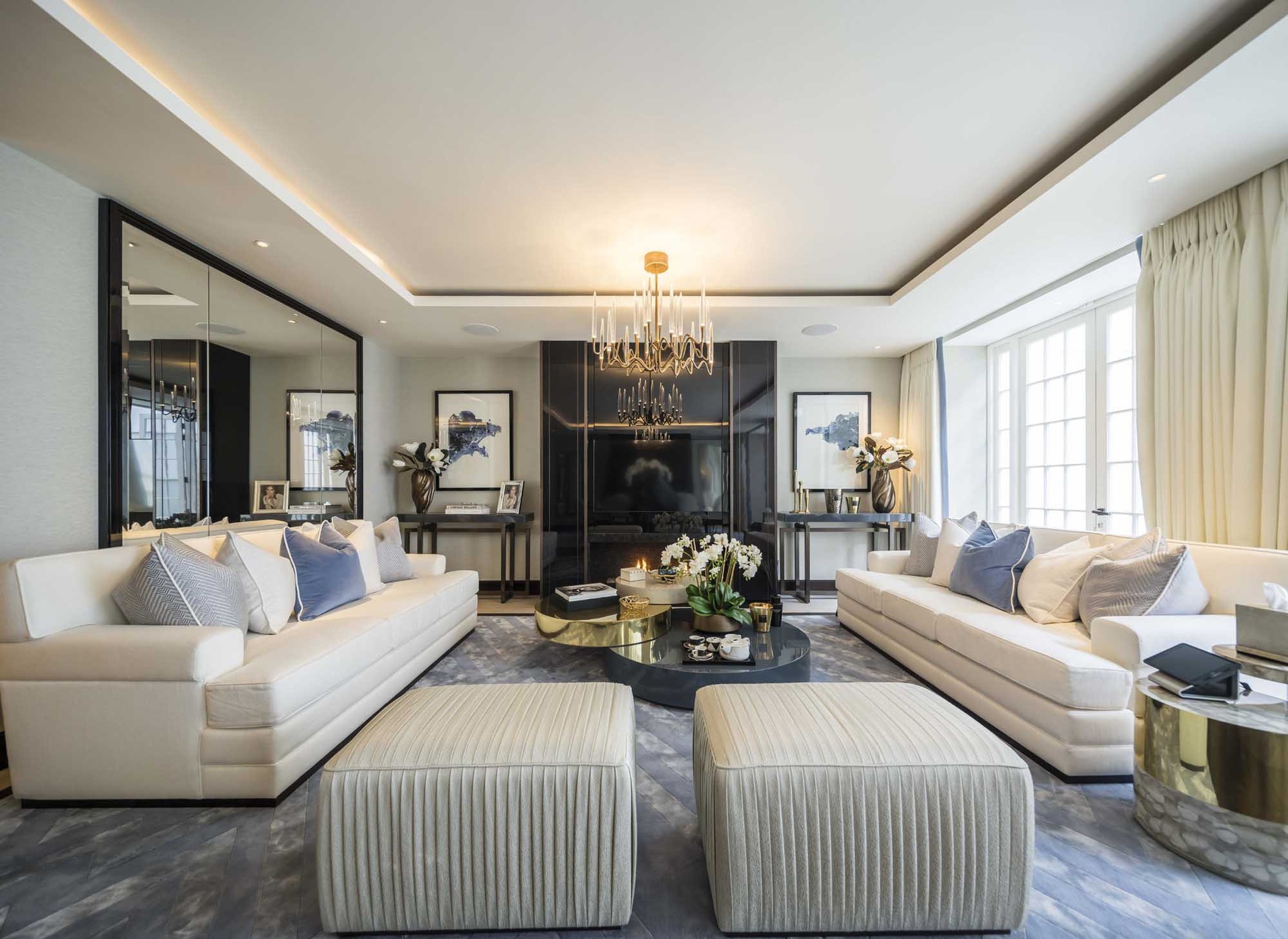 On the first floor, there are two magnificent master bedroom suites, comparable in size and both elegantly dressed, with luxurious woven-silk carpets and Hermes cushions and throws. Both have fully fitted dressing rooms. The master bathroom has been finished in Bianco Vein white marble, with the guest suite finished in Calacatta and Namibian white marble, with both bathrooms having Lalique taps and walk-in rainforest showers. The kitchen has a classically elegant and timeless bespoke kitchen by Smallbone of Devizes, with remote activated Miele ovens, an intelligent fridge freezer, and instant boiling water taps. A seating area sits below a large skylight, providing the perfect family space for cooking, relaxing and informal entertaining.