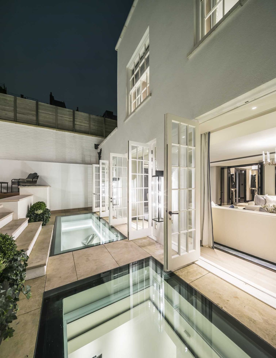 Accessed directly off the drawing room is the beautifully landscaped two-tiered garden finished with ‘self-cleaning’ Portland stone, as well as artificial grass for low maintenance but no less attractive appearance. Finished with planters, individual pots, and a mature tree, as well as stylish lighting and an integrated sound system, it provides the perfect space for alfresco entertaining.
