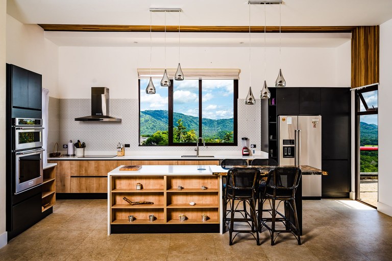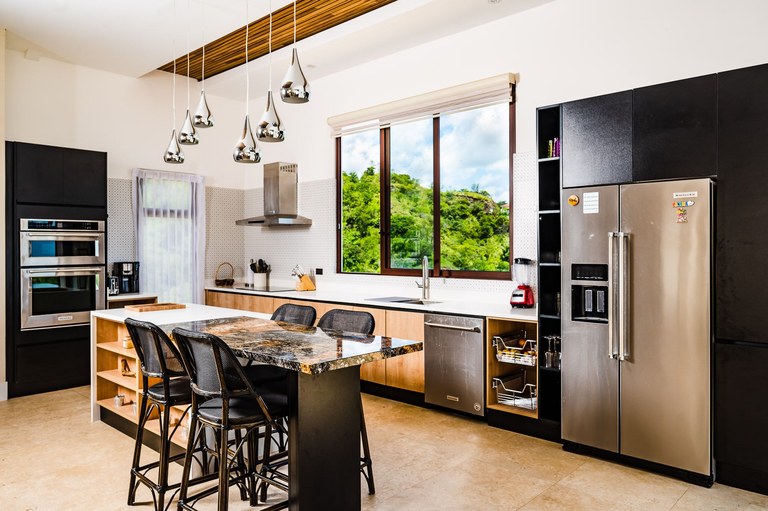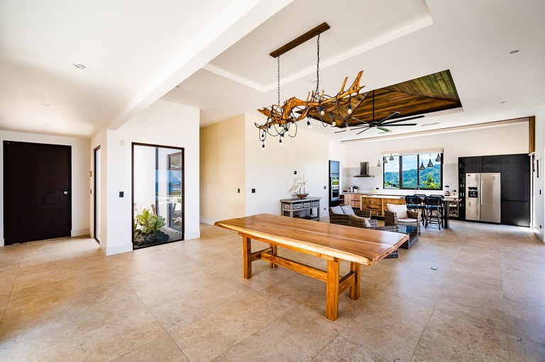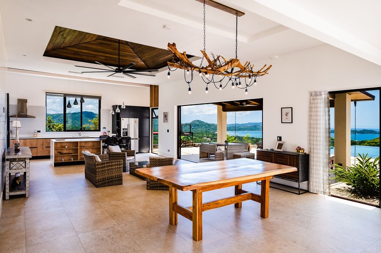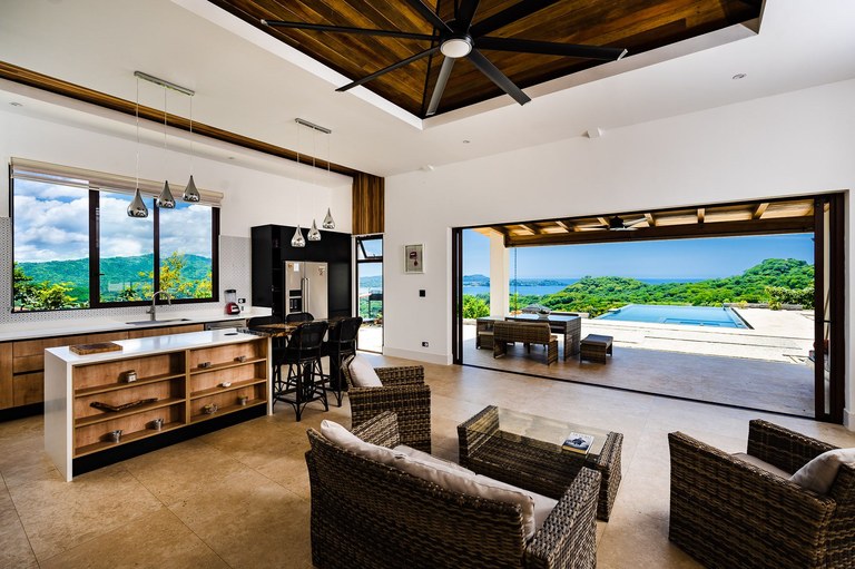 Upon entering Casa Blanca, you will find yourself in the kitchen and living area, where you can see wide open spaces, tray ceilings that create captivating focal points, and high-end accordion style doors that open beautifully to the blue skies, lush jungle, and turquoise waters of Pacific Ocean.