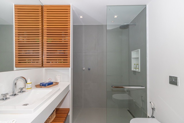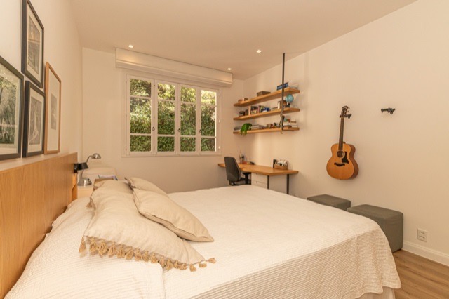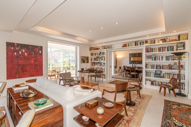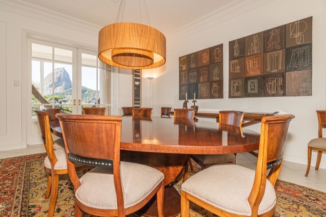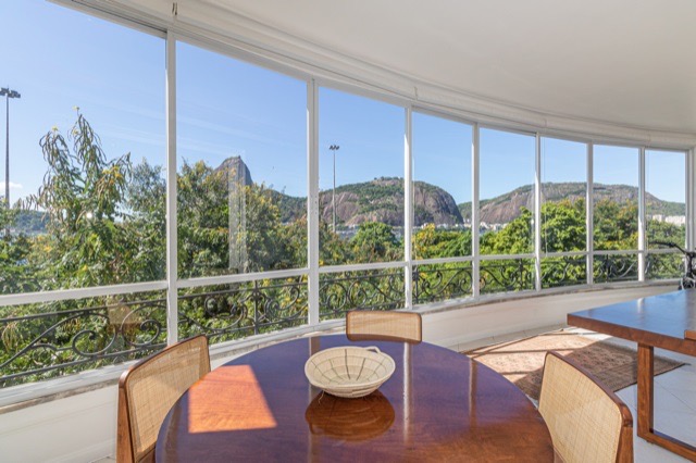 High-end luxury apartment, completely renovated with panoramic views of Sugarloaf Mountain and Guanabara Bay. Originally 5 bedrooms, transformed into 4 bedrooms (including 2 suites – 1 double master suite and 1 single suite). Circular floor plan, social area facing the front (Av Rui Barbosa and the bay), and very quiet bedrooms facing Morro da Viúva (view of the rock and green foliage). Separate service entrance from the social area, connected by a communicating door. There are 5 completely renovated bedrooms (2 combined in the master suite and 1 used as a gym). The bedroom area is covered with Ekko hardwood flooring, with a light and natural wood finish. Lacca custom cabinetry in the master suite, bathroom, ante room, office, and closet, featuring a walk-in closet with shoe racks, handbag storage, drawers, luggage storage, jewelry compartments, belt hangers, and tie racks. Lacca partition doors (large mirror on both sides). The middle bedroom and suite 2 have spacious wardrobes with Carpinta custom cabinetry. Lacca bookshelves and cabinets in the hallway. 4 fully renovated bathrooms (plumbing and finishes). Separate office in the living room, with a library (perfect for a home office). 2 living rooms, 1 spacious guest bathroom with windows. Spacious winter garden with Uniflex roller blinds with independent manual controls. Large dining room (with independent air conditioning). High-power Rinnai heaters (2019) centralized in the service area (1 serving the 3 interior bathrooms and another serving the service bathroom area and kitchen sinks). Gas passage from the 2 heaters embedded in the lowered ceiling of the service area with chimney for exhaust. Double laminated glass windows in the kitchen, service area, and winter garden, providing excellent sound insulation. Bedrooms with automated external Uniflex blinds and automated blackout blinds as well. Wi-Fi repeaters throughout the entire house. 3 TV points with Apple TV / Wi-Fi. 10 split air conditioning units with remote control in each room; bedroom units with hot and cold inverter. Master suite bathroom with Decca chromed fixtures (top of the line), 2 sinks, and mirrored cabinets along the entire countertop. Walk-in pantry; walk-in china cabinet. Perfect electrical and plumbing renovation, new electrical panel; Kitchen with Metalmaq industrial stove that will remain in the apartment. Work executed by BWEng. Architectural design by Pró-Arquitetura. 1 parking space (no need for maneuvering). Storage room on the 15th floor (6m², with window).
