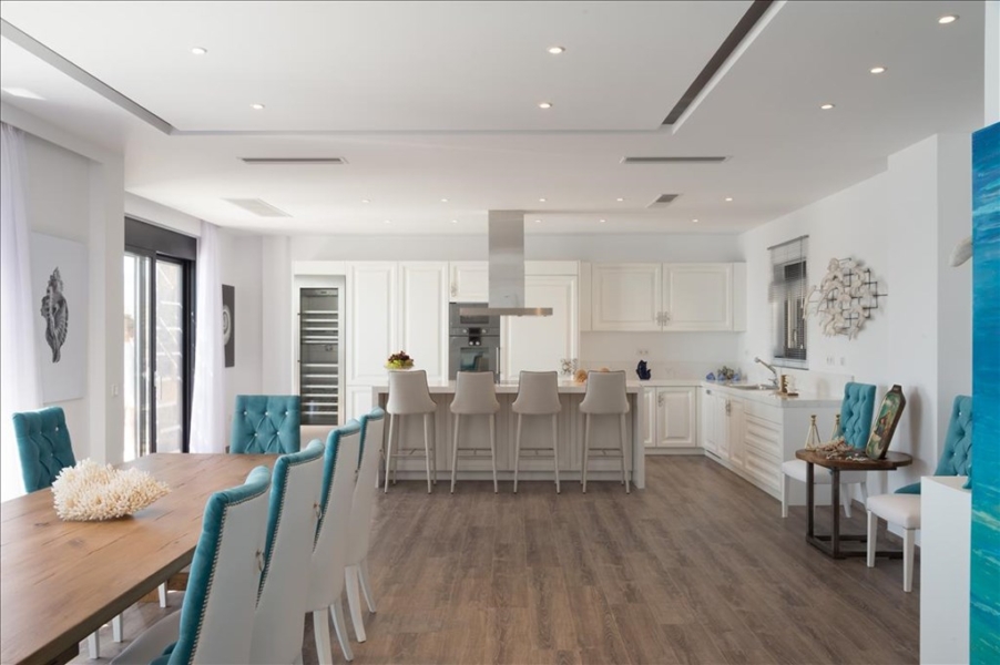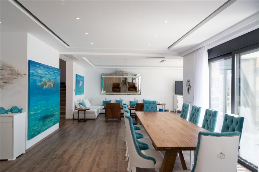 At the lowest level of the house, there is a living room with a kitchen and 2 bedrooms with en suite bathrooms, as well as a personal room. The ground floor has a spacious living room, dining room, kitchen, and a spacious veranda overlooking the swimming pool. On the first floor, there are 2 bedrooms with en suite bathrooms.
