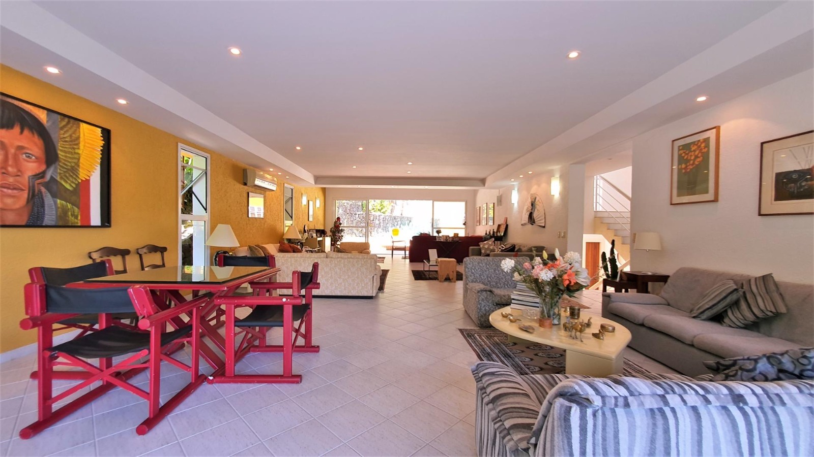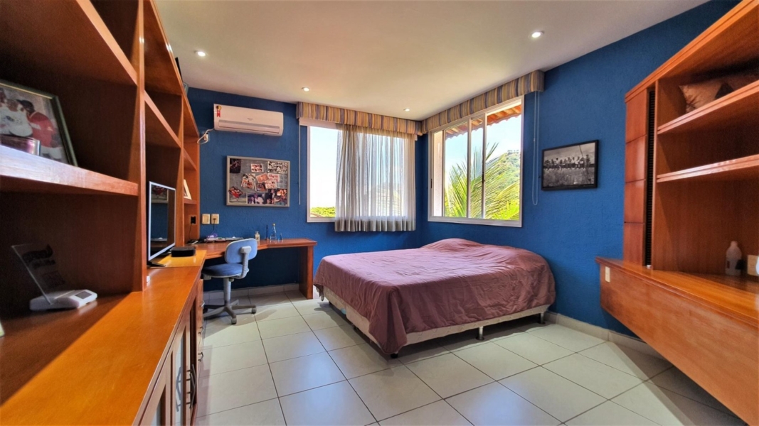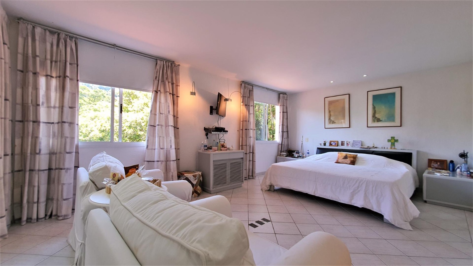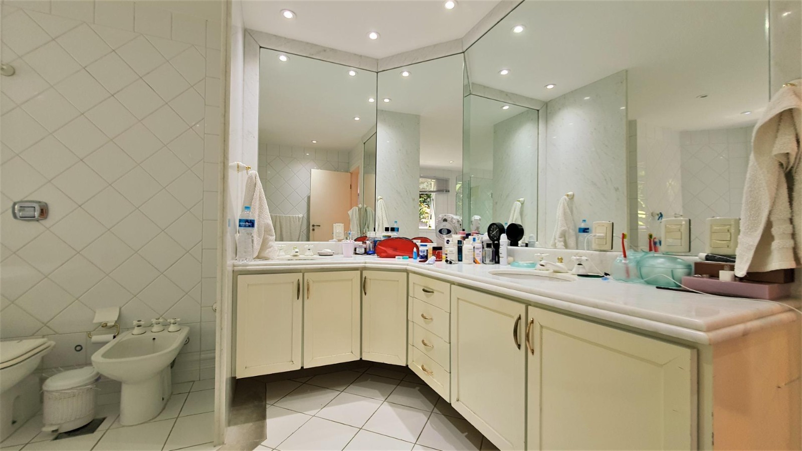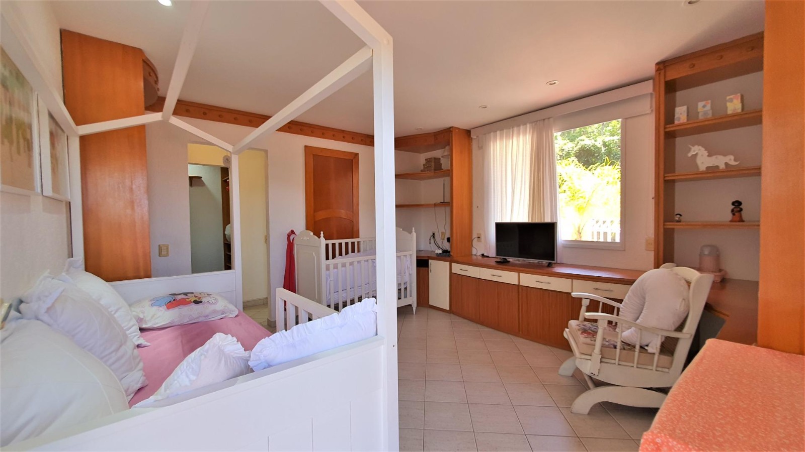 The result is a seamless integration of all spaces with the surrounding greenery and light. Its details: on the ground floor, three well-divided levels, a large guest suite. On the first floor, a spacious balcony opens to the grand living room, extending to the pool and leisure area. On the same level, you will also find a powder room and a generously sized TV room. It is filled with numerous windows that reveal the hillside. The breakfast area and kitchen are adjacent to the rear terrace, where the pool is located. Industrial stove and hood are at the heart of the space, allowing service for a large number of people. On the second floor, there are two more suites, each with its own walk-in closet, as well as a linen room. On the third floor, there’s the master suite with two walk-in closets. From its windows, you can see the horizon with the sea, in addition to lush greenery. The master suite’s bathroom is spacious and features a jacuzzi whirlpool tub and two sinks.