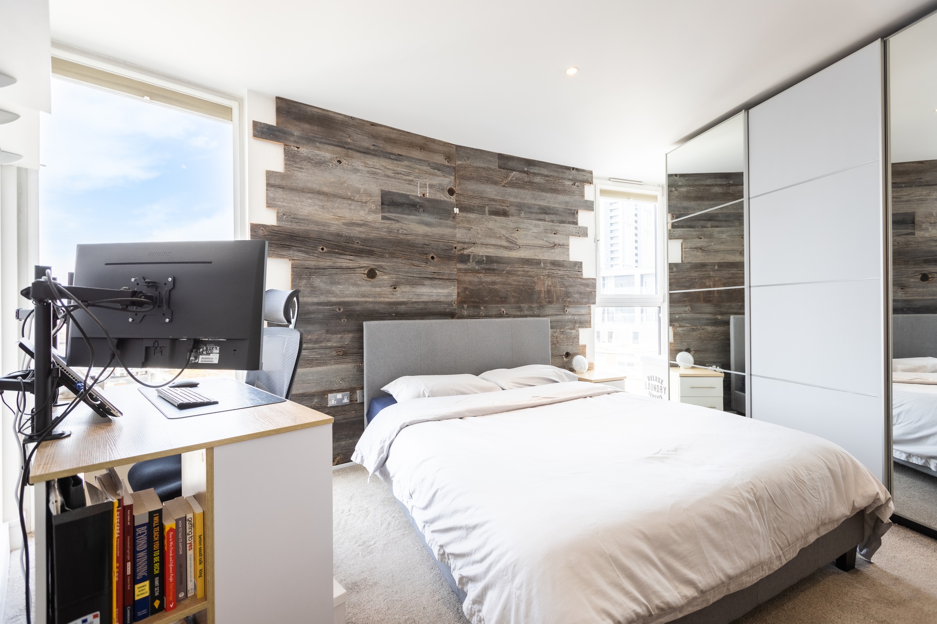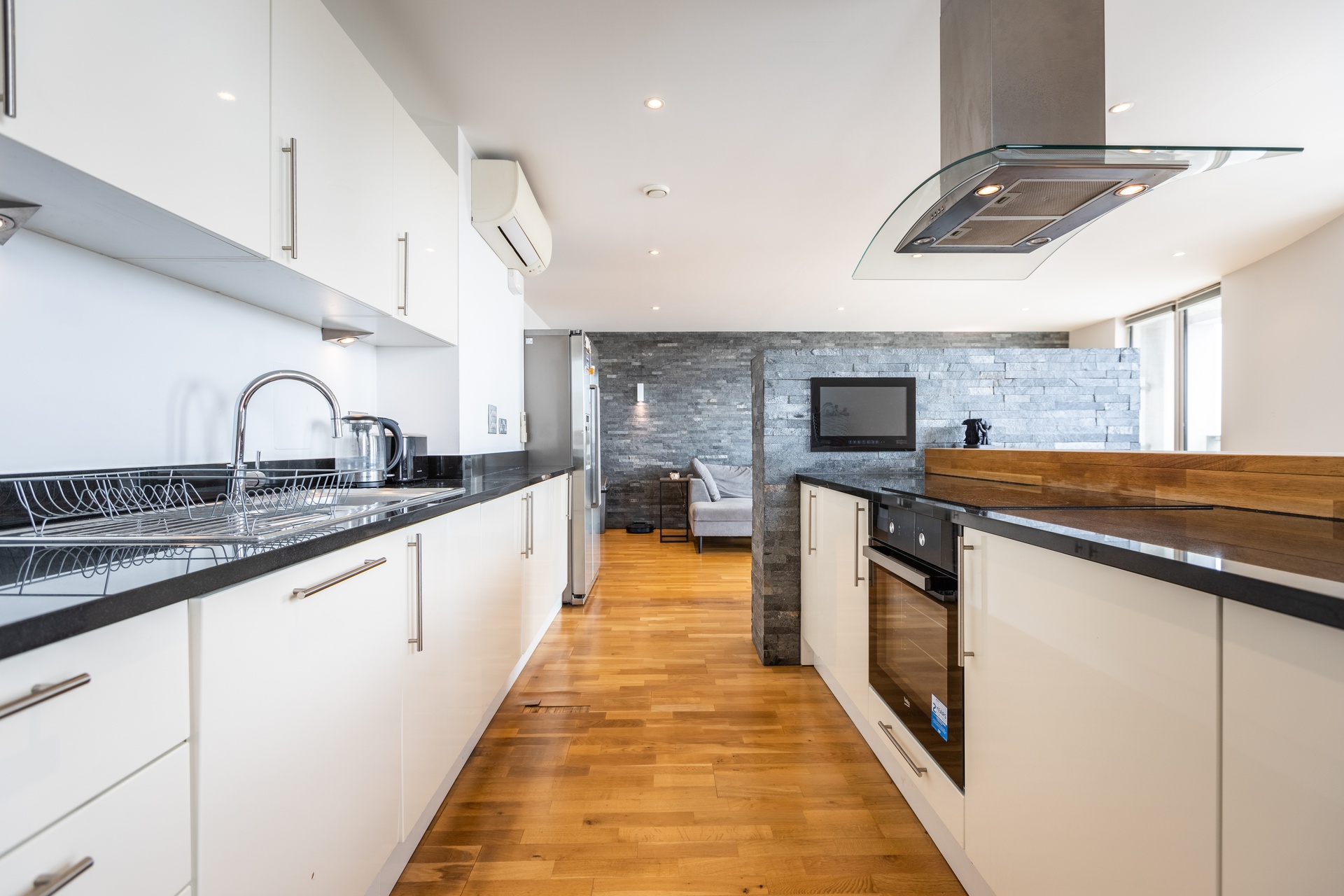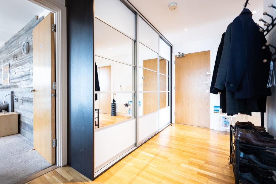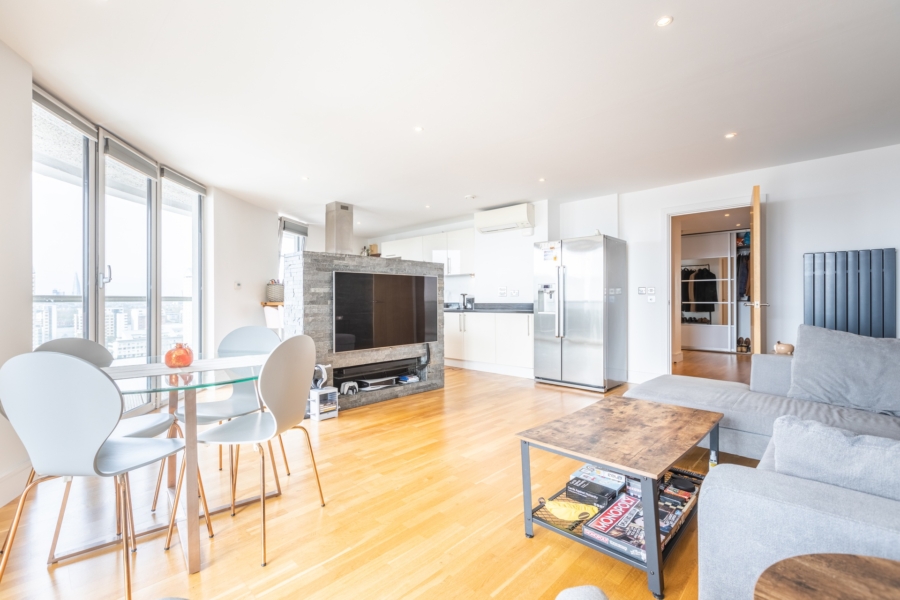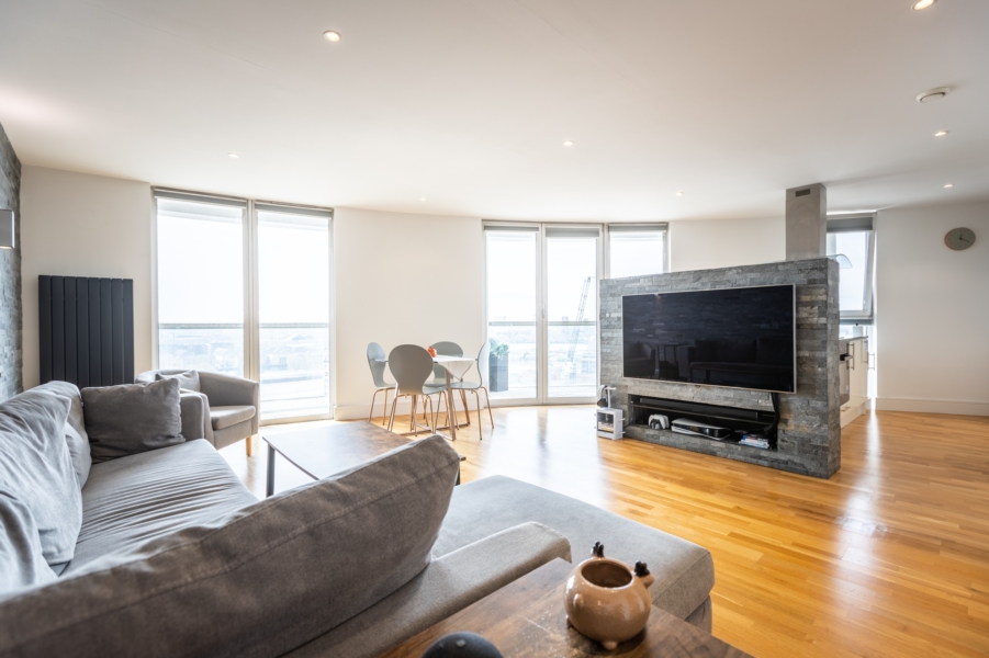 There is an amazing 180 degree wrap around, a south/west facing balcony with views of the River Thames and London’s Iconic skyline, a perfect space for alfresco dining.