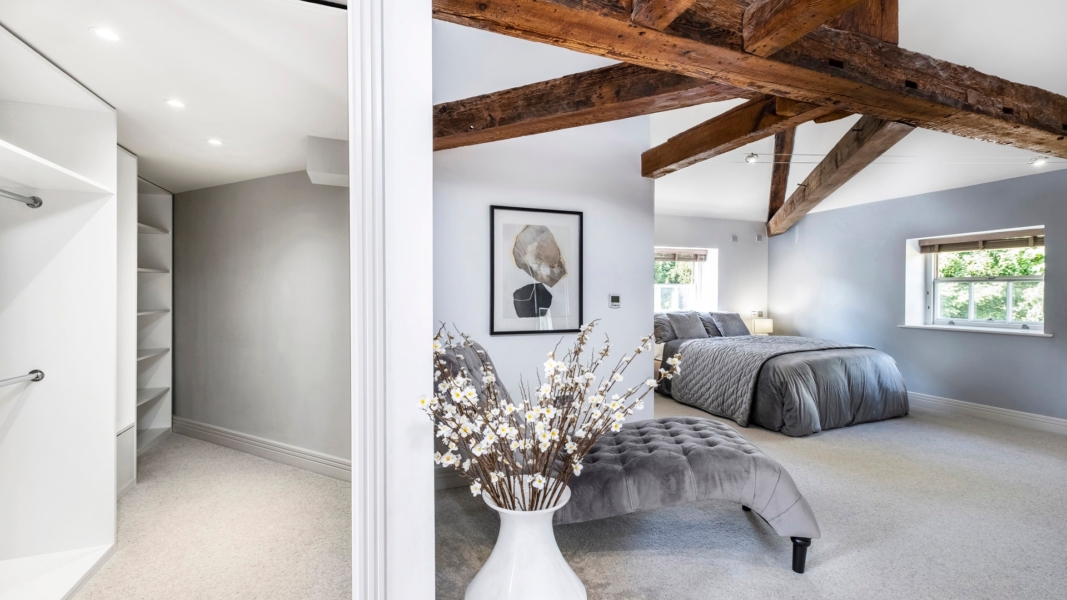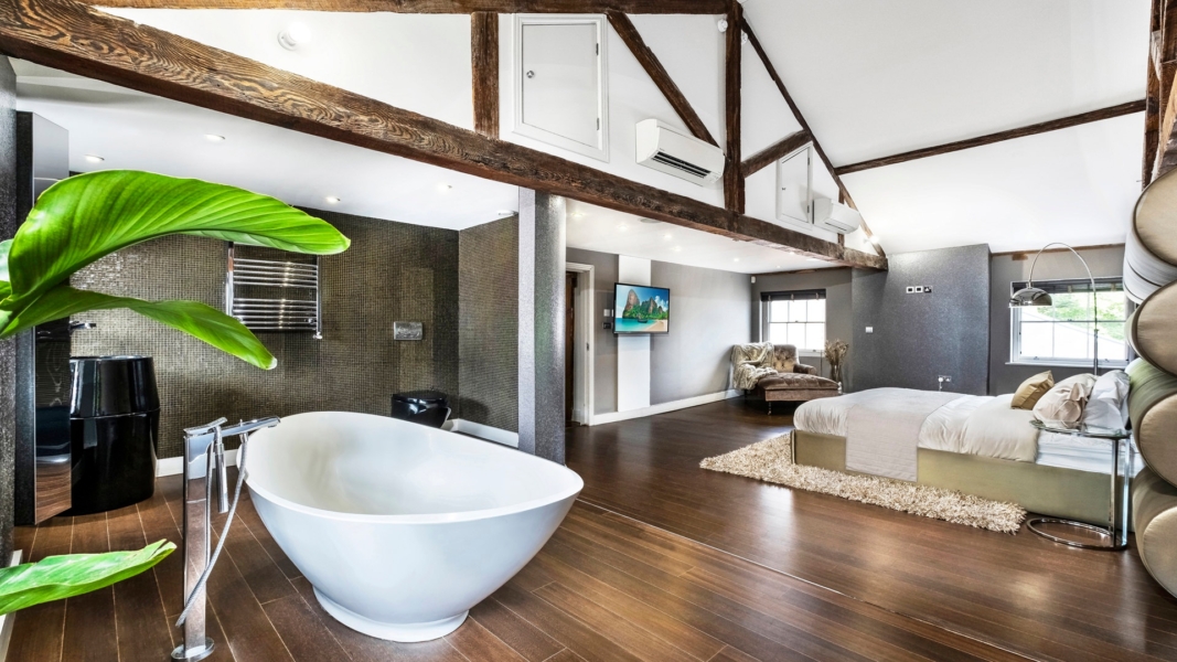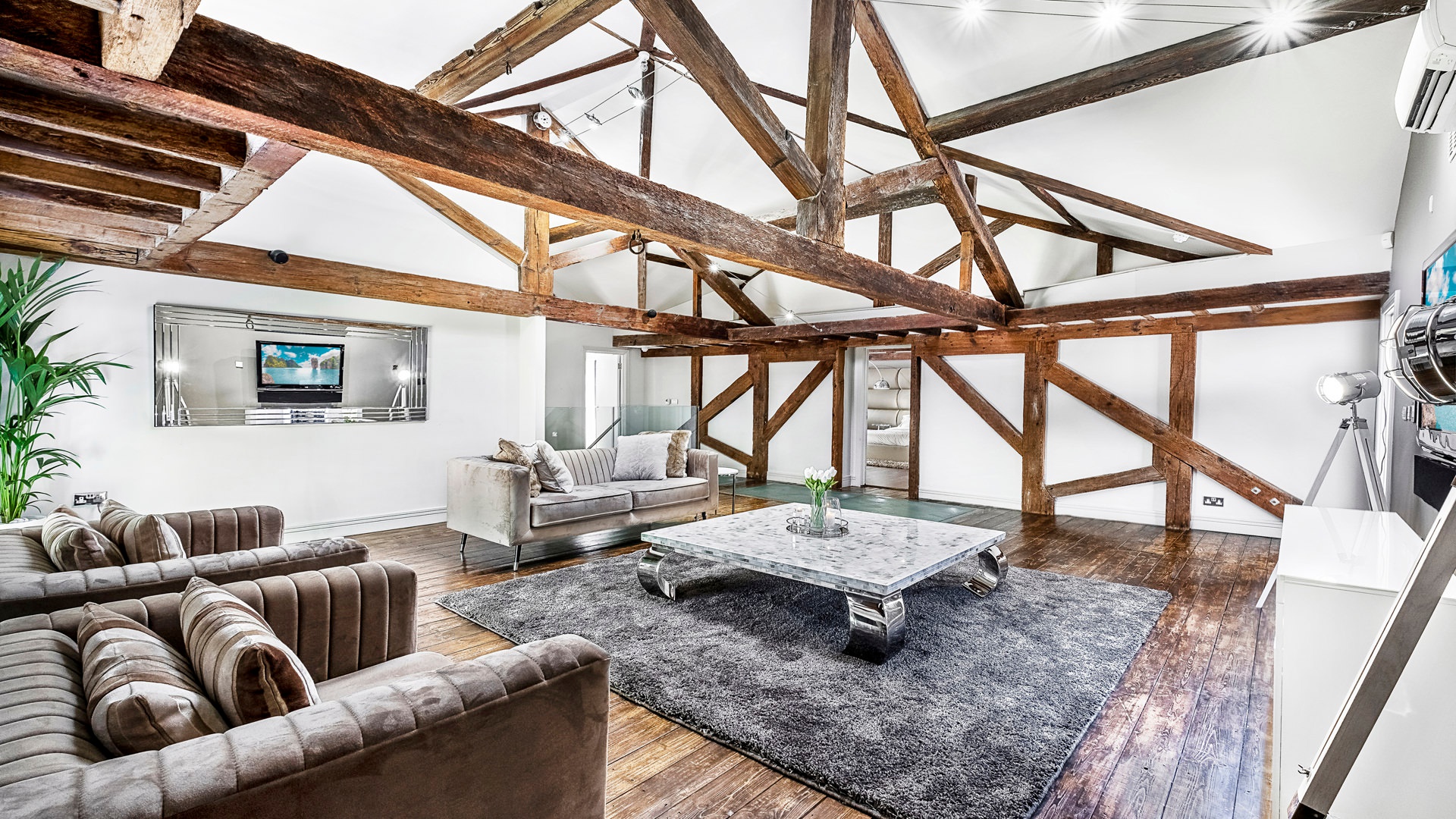 Arranged on the first floor is an impressive sitting room with a vaulted ceiling and exposed timbers; three bedrooms with en suite bath/wet rooms. There is also access to the balcony from one of the bedrooms.